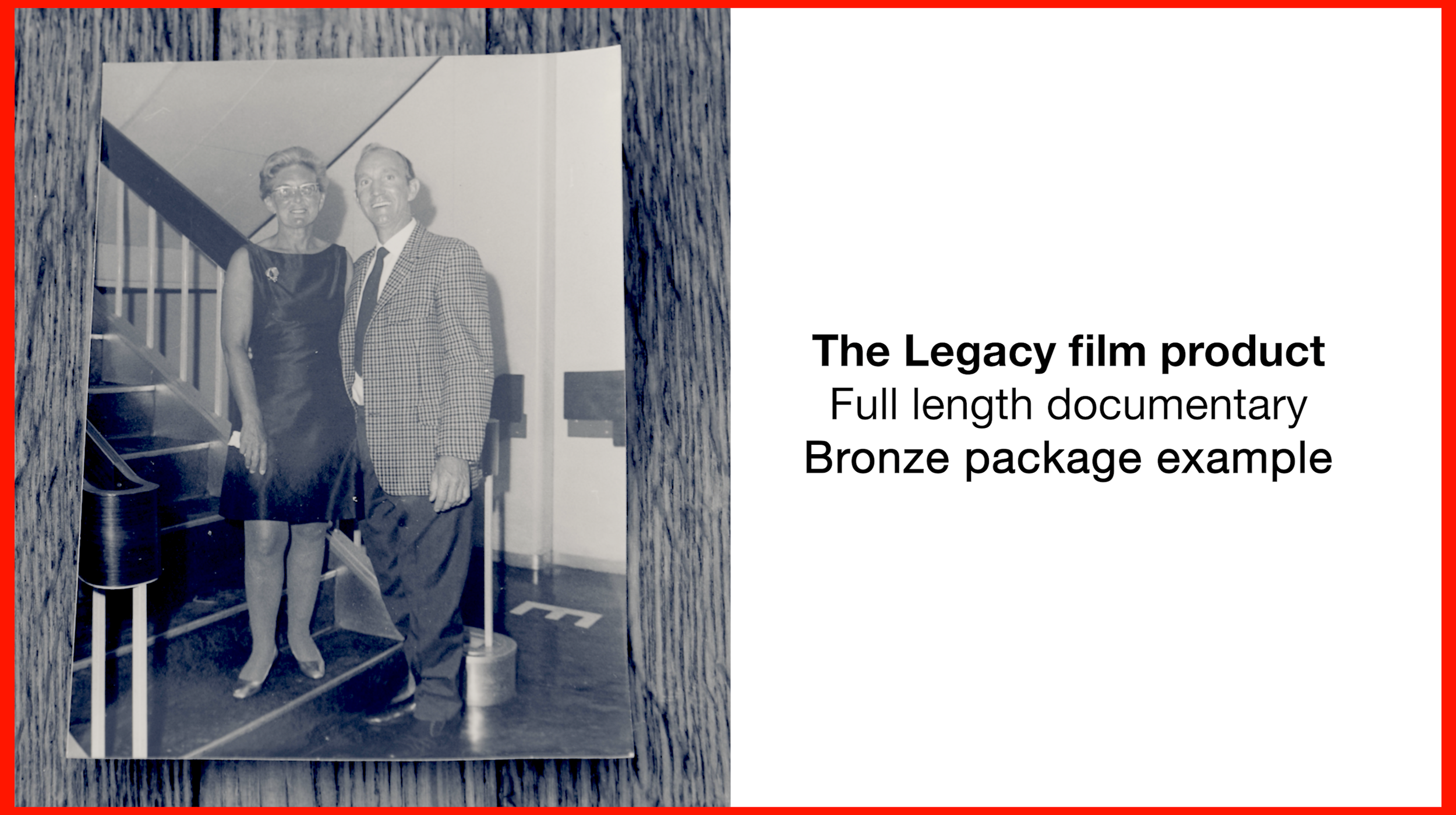 The video below showcases the packages offered for the Legacy film product. A full Legacy film, also known as the bronze package, is available to watch at the bottom of the page.